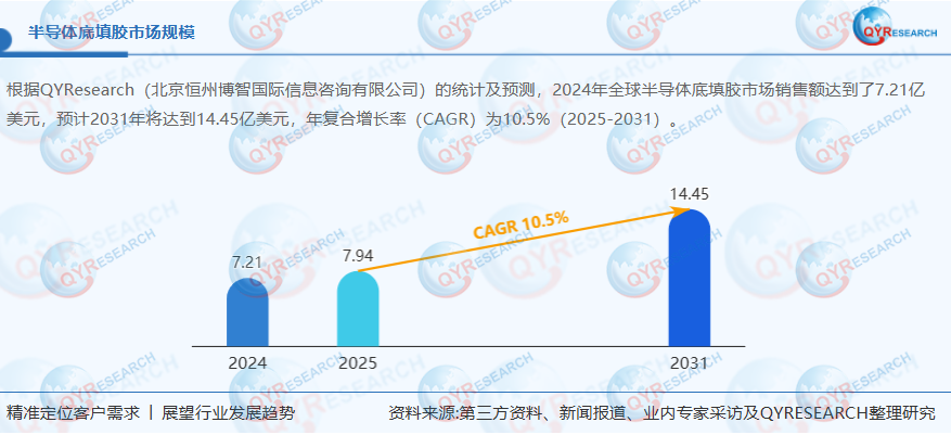 半導體底部填充技術起源于20世紀70年代的IBM公司,最初應用于陶瓷基板領域,后隨著有機基板取代陶瓷基板而實現規模化應用。全球半導體底部填充膠市場預計以10.48%的年復合增長率(CAGR)持續擴張,2024年市場規模達7.21億美元,2031年將突破14.43億美元。中國市場表現尤為突出,預計2031年全球占比將達24.72%,增速顯著高于全球平均水平,這主要得益于新能源汽車、AI芯片、5G通信等新興技術領域的快速發展。